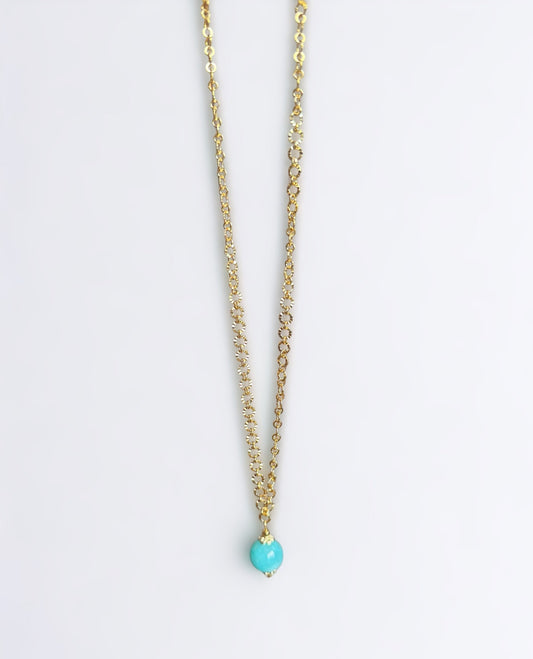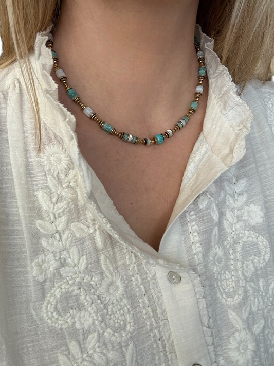 Le conseil de Philomène : L’amazonite est une pierre très lumineuse et estivale qui se marie parfaitement avec du jean, des vêtements blancs pour une tenue chic ou décontractée en journée ou avec une tenue noire pour une soirée d’été. Elle pourra aussi illuminer un pull noir ou bleu marine en hiver.