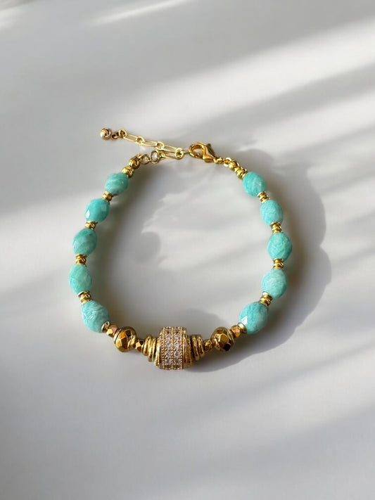 L’Amazonite est une pierre couleur bleu d’eau lumineuse variant au vert bleu turquoise. Elle peut présenter de fines rayures blanches.