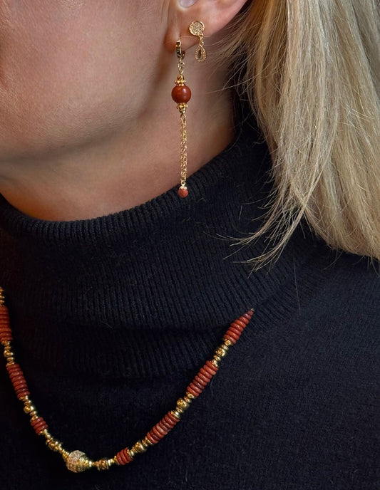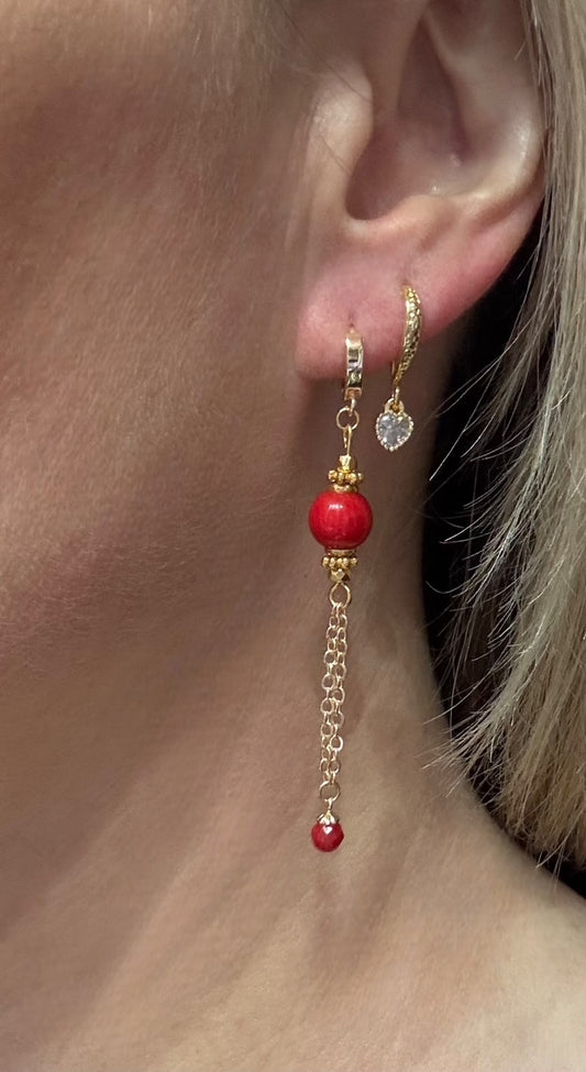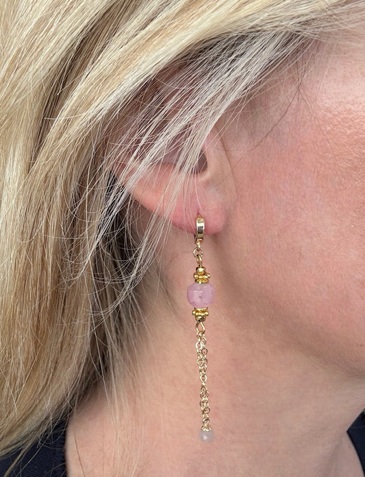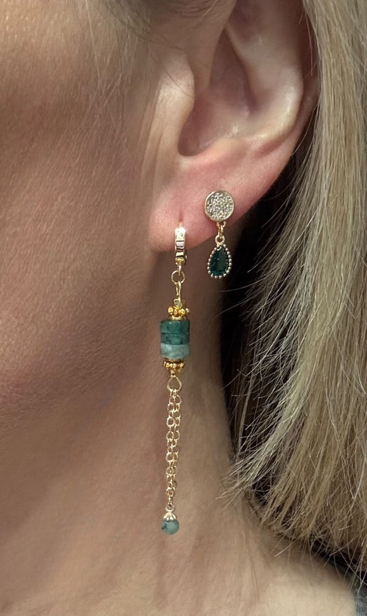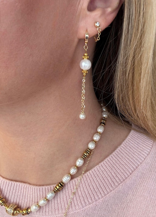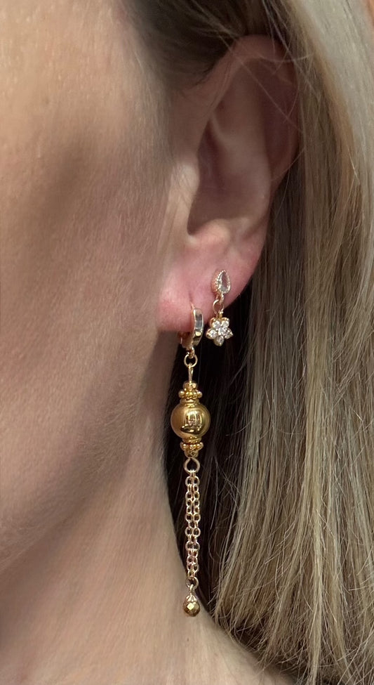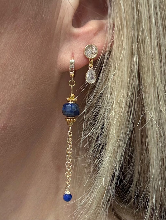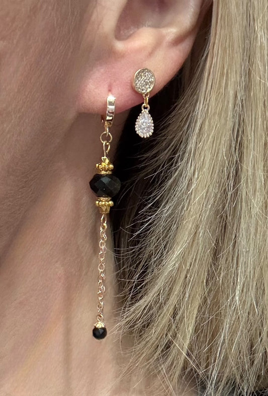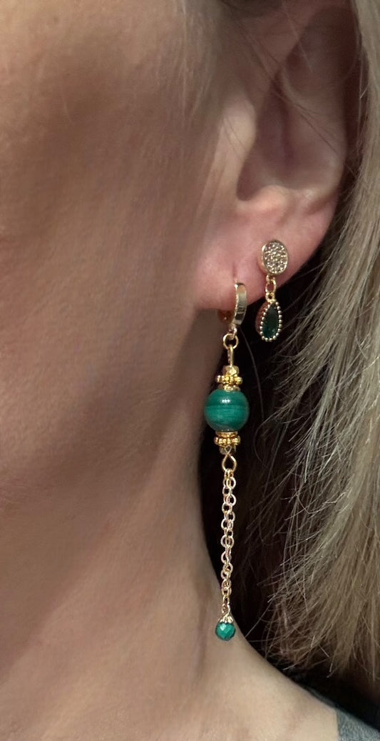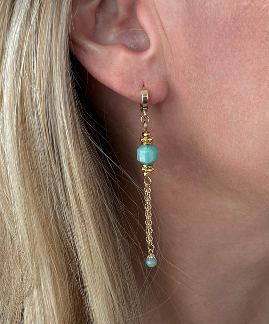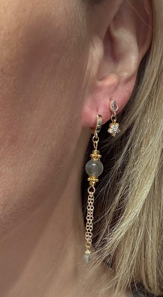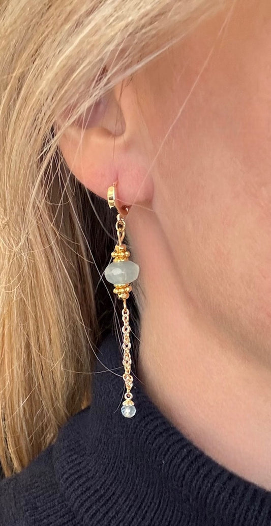 Chaque boucle s’ouvre sur une petite créole, habillée d’une pierre semi-précieuse : rondes lisses ou rondelles facettées… Deux chaines finement doublées, portées par le mouvement et se termine par une petite pierre facettée ajoutant une touche finale de délicatesse et de brillance telle une goutte de lumière suspendue. LIMA est une ode à la féminité subtile et au charme intemporel.