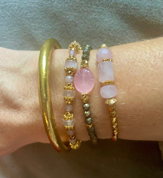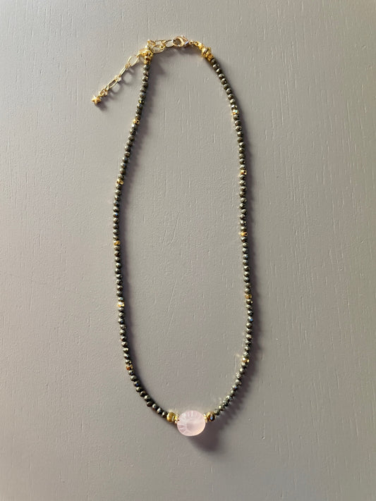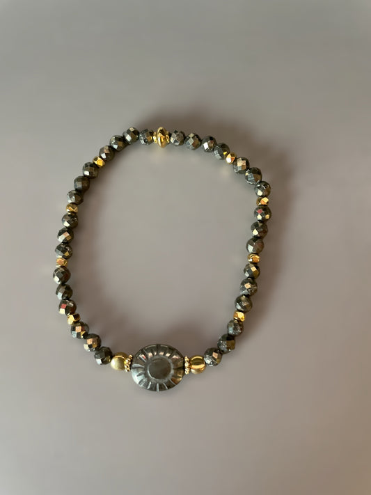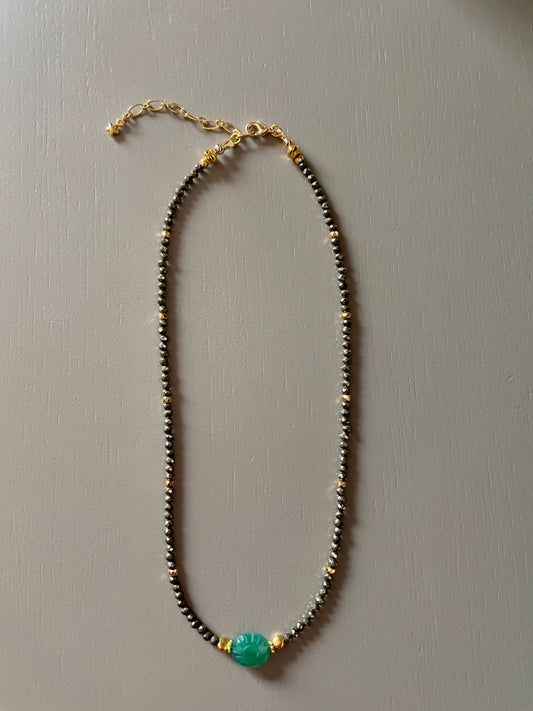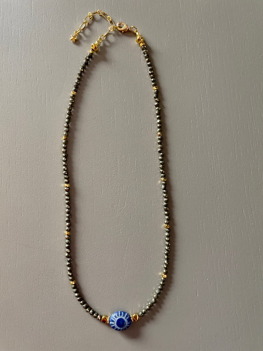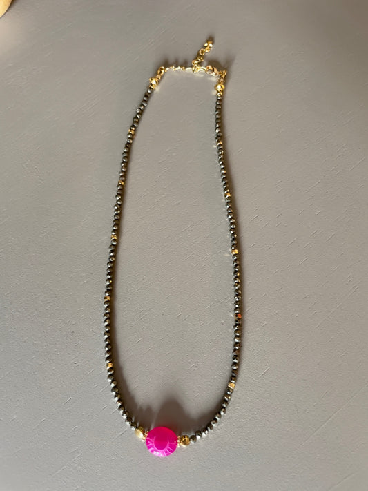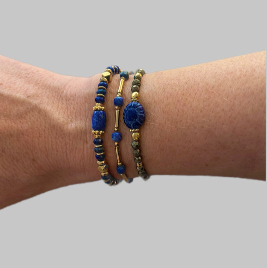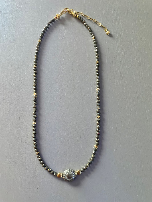 En Polynésie « Mahana » signifie « Soleil ». Philomène a associé ces pierres fines sculptées en forme de soleil à des petites pierres de pyrite afin de faire une collection lumineuse et chaleureuse faisant référence à la lumière et à la vitalité du soleil. Le nom de Mahana en Tahitien s’est naturellement imposé.