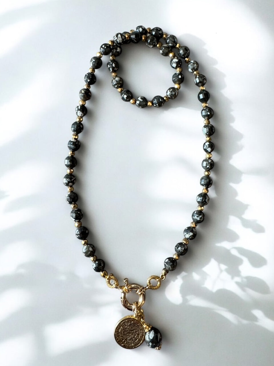 Collier de pierres semi-precieuses intercalées d'hématites plaquées or 24 carats AAA+ avec médaille en laiton dorée à l'or fin 24 carats et breloque en Obsidienne mouchetée.