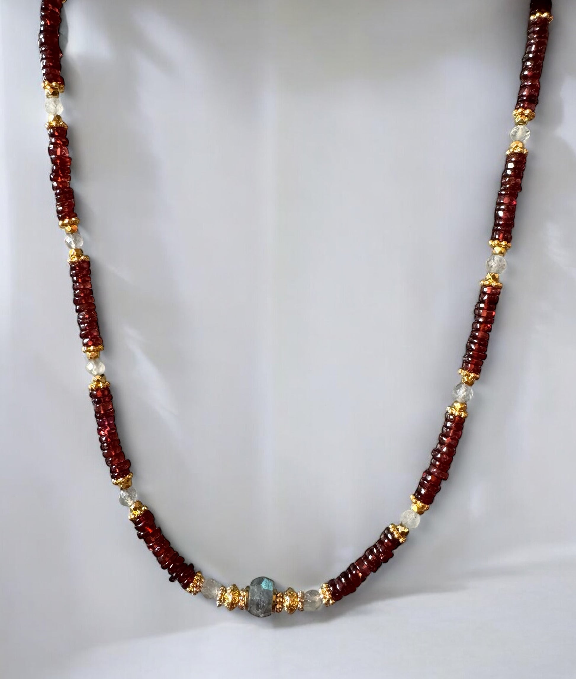 Le collier Bahamas connu dans sa version estivale en Amazonite se décline désormais pour l'hiver dans des teintes plus profondes en Grenat et Labradorite. Une version hivernale du collier surfeuse, élégant et facile à porter.